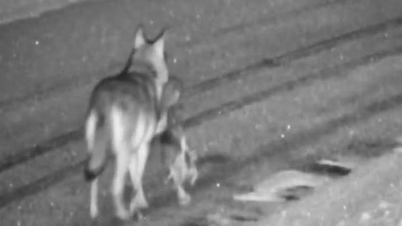 Bir iş yerinin güvenlik kamerasına yakalanan kurt, avıyla birlikte karanlığa karıştı.