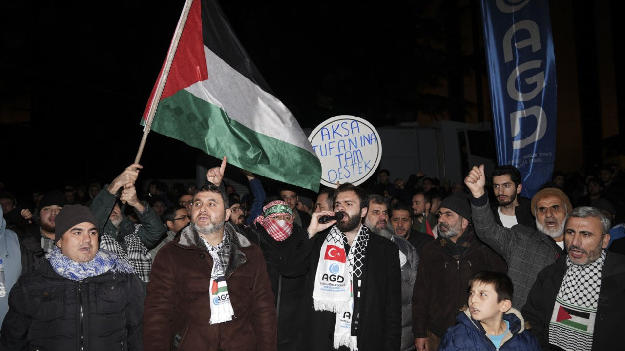 AGD üyeleri, "Aksa tufanına tam destek", "Zalime karşı dur, mazluma yardım et" yazılı dövizler taşıyarak, "Katil İsrail", "Hamas'a selam, direnişe devam", "Vur vur Hamas vur" şeklinde sloganlar attı.
