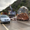 AA - Ağullu Mahallesi Ambarlar mezarlığı mevkisinde yağış nedeniyle yamaçtan kopan yaklaşık 40 tonluk kaya parçası Antalya-Kaş karayoluna sürüklendi.
