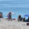 Başının üstünde taşıdığı tepside midye dolma satan seyyar satıcı, uzakta zabıtayı görünce güneşlenenlerin arasına oturdu. Zabıtanın uzaklaşmasının ardından tepsisini gizleyerek, sahil şeridinde yürüyen seyyar satıcı, daha sonra satış yapmaya devam etti.