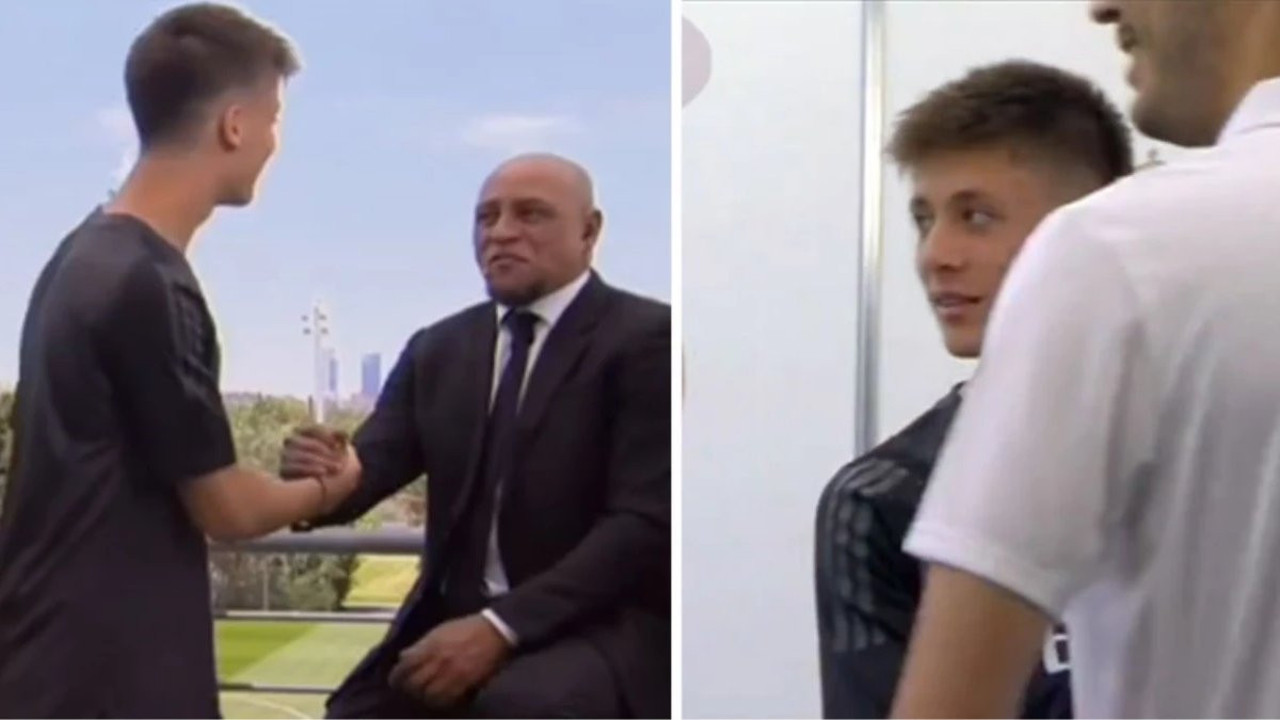 Arda Güler ise Roberto Carlos karşısında şaşkınlığını gizleyemedi ve arkasını dönüp Roberto Carlos'a baktı.
