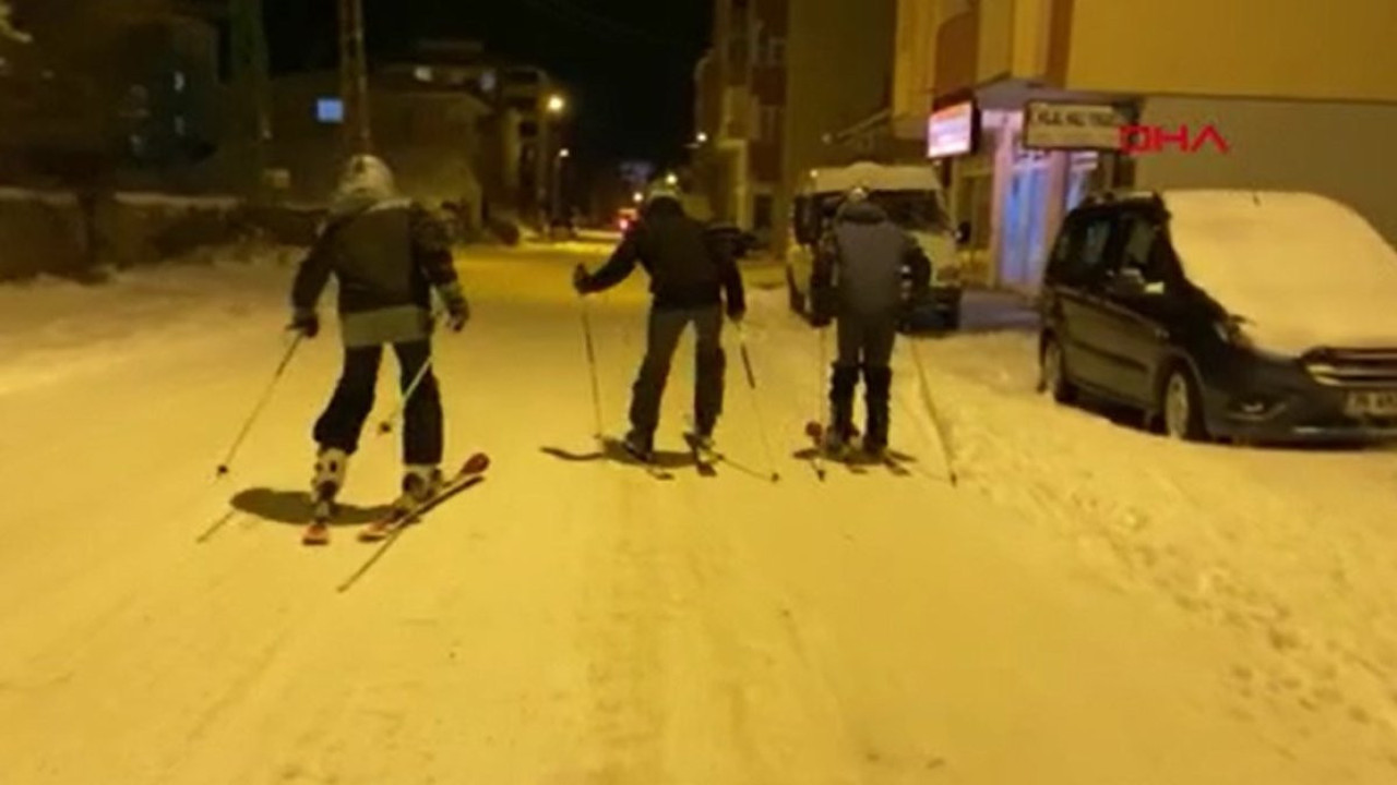 Yeterli kar olmadığı için Yalnızçam Kayak Merkezi'ne gidemeyen 3 arkadaş, kent merkezinde kayak takımlarını giyerek cadde ve sokaklarda kayak yaptı. Kayak yapmayı çok sevdiklerini belirten gençler, kayak merkezi açılana kadar cadde ve sokaklarda kayak yapmaya devam edeceklerini söyledi.