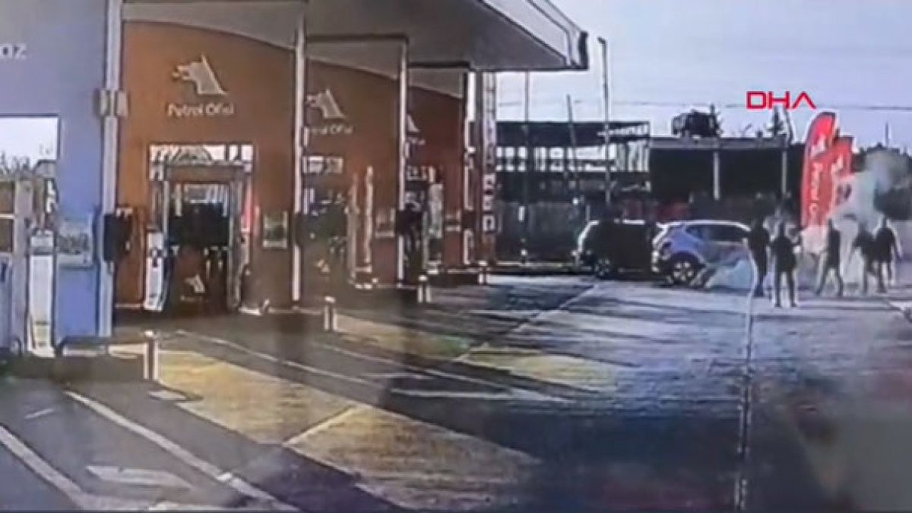 İstasyondaki güvenlik kamerasına yansıyan görüntülerde motor kısmından yanan araca çalışanların yangın tüpüyle müdahalesi yer aldı.