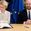 Brüksel’de bu sabah atılan imzaya, üç yıla yakın süredir zorlu geçen müzakereleri yürüten Fransız diplomat ve eski bakan Michel Barnier de katıldı.