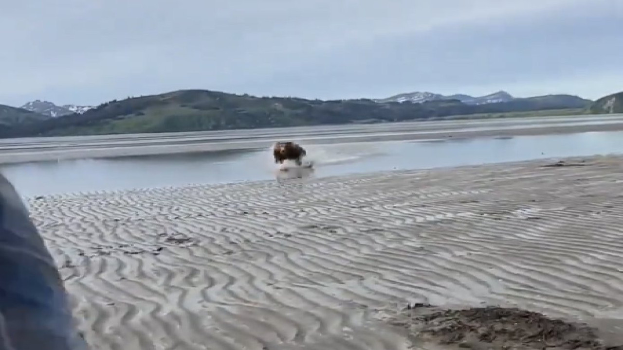 Videoda rehber ayının üzerine doğru bağırarak koşup ayıyı korkutup kaçırmayı başarıyor.