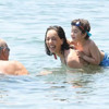 Plajda önce babası ve annesine güneş kremi süren tescilli güzel, daha sonra oğlu Demir’le beraber denize girdi.