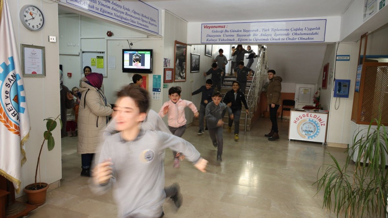Tatbikat sırasında okul personeli senaryo gereği "Yangın var, herkes dışarı" diyerek herkesin güvenli bir şekilde dışarı çıkmasını sağladı.