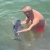 Çırpınan yunusu fark eden balıkçılardan biri hemen suya atlayıp, yunus balığını kurtarmak için seferber oldu.