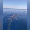 Daha sonra tekne, balina köpek balıklarının olduğu bölgeye doğru yaklaştı. Teknenin ucuna oturan Al-Harbi, teknenin yanına yanaşan bir balina köpek balığının sırtına bindi. Al-Harbi sırt yüzgecine tutunduğu köpek balığın ile denize açılırken, o anlar da adamın arkadaşları tarafından kayda alındı.