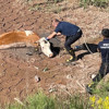 İtfaiye ekiplerinin ineği boynuzlarına bağladıkları iple çekerek saplandığı yenden çıkardığı anlar cep telefonu kamerasıyla kaydedildi.