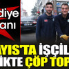 Temizlik aracının arkasına tutunan Başkan Köse, çöp konteynerlerini çöp kamyonuna boşalttı, dökülen çöpleri yine mesai arkadaşları ile birlikte topladı.