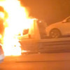 Hasarlı araç yüklü 34 DND 380 plakalı çekicinin seyir halindeyken motor kısmı birden alev aldı.
