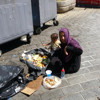 Çöp konteynerlerinin yanında kucağında bebeği ile oturan bir dilenci kadının ise duygu sömürüsü pes dedirtti. Çöpten topladığı ekmekleri bir poşete dolduran dilenci bunları yiyormuş gibi görünerek duygu sömürüsü yapıp insanlardan para dilendi.