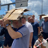 Kavurucu sıcak altında tatlı alabilmek için saatlerce bekleyen vatandaşlar güneşten korunmaları için tatlıcıda çalışanların dağıttığı karton kutuları başlarına koyarak korunmaya çalıştı.