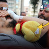 Kazada yaralanan Ahmet Kestanlıoğlu, sedyeyle katıldığı törende çocuklarının peluş bebeklerine sarıldı.