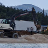 Sahile dökülen kum, kaldırılması için firma tarafından çalışma başlatıldı. İş makineleri ile toplama çalışması yapılırken Bodrum Belediyesi Zabıta Müdürlüğü ekiplerinin de bölgede hazır beklediği görüldü. Deniz içerisindeki beton blokların kaldırılması için de talimat verildi.