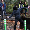 Meşaleler yakan ve ses bombaları atan "sarı yelekliler", çevredeki tabelaları da devirdi.