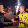 Burak Oynalı, elinde pastayla otomobilden indi. Karşılaştıkları durum karşısında şaşıran polis ekipleri, pasta üzerindeki mumları söndürüp sürücüye teşekkür etti.