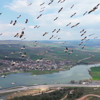 Pelikanların göç yolculuğu ile barajda mola verdiği anlar, dronla havadan görüntülendi. Görüntülere baraj çevresinde konaklayan leylekler de yansıdı.