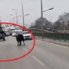 Duran trafikte, bir süre araçların arasında dolaşan boğa, kendisini yakalamak isteyen ekiplerin elinden kaçarak gözden kayboldu.