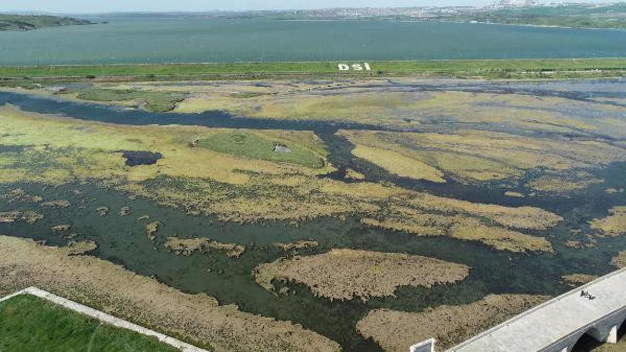 Hava sıcaklıklarının artması ve etkisini kaybetmeyen rüzgar nedeniyle Büyükçekmece Gölü'nün Marmara Denizi ile birleştiği bölgede suyun yüzeyinin yosunla örtüldüğü görüldü.