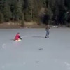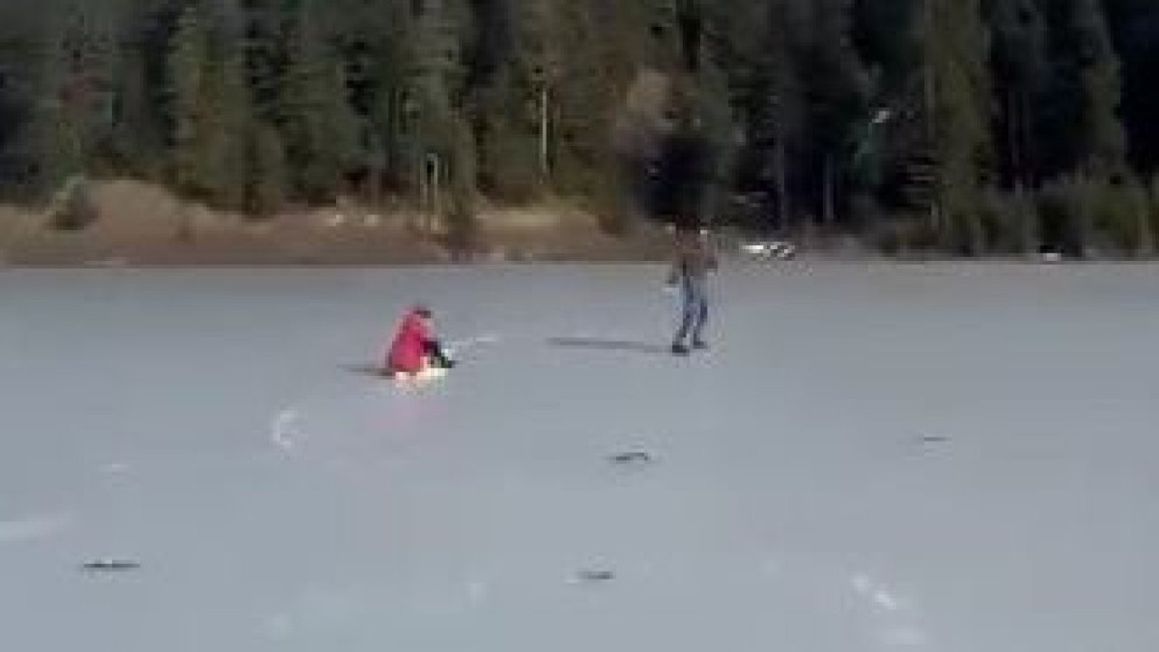 Bölgeye gelen bir aile buz tutan göletin üzerinde hem yürüdü hem de kızakla kayak keyfi yaşadı. O anlar cep telefonu kamerasıyla görüntülendi.