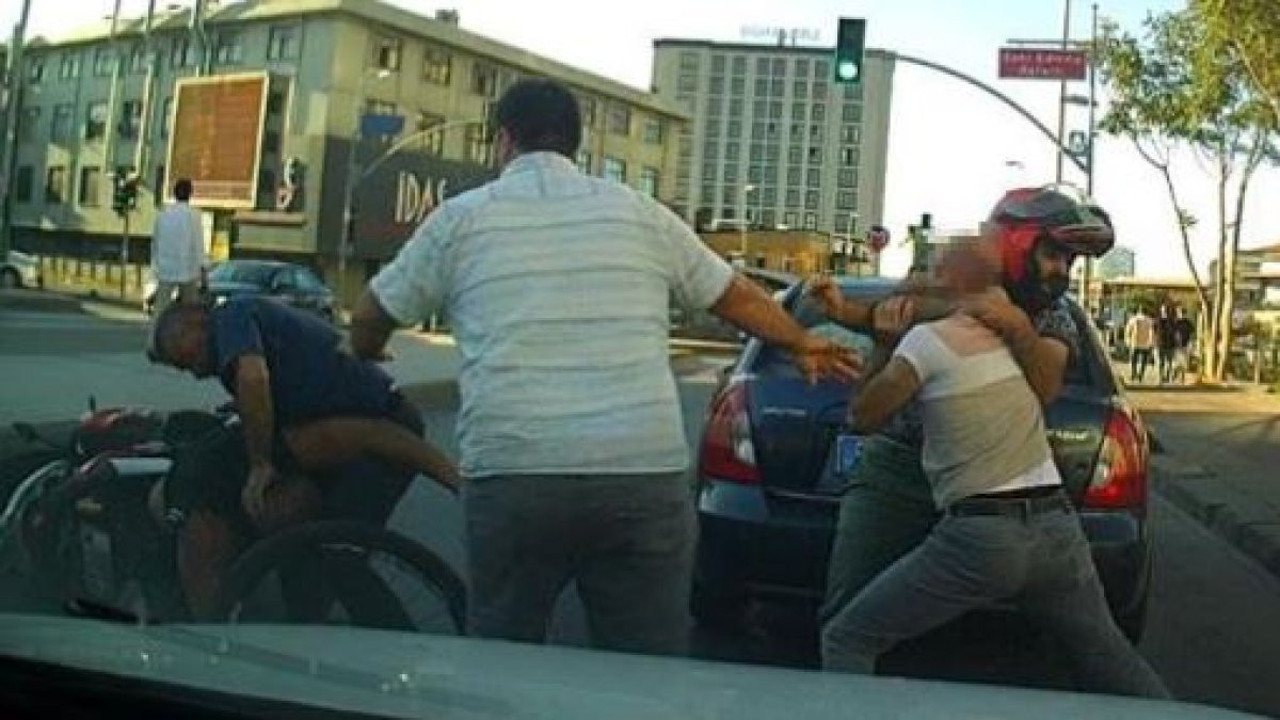 Taraflar bir süre gittikten sonra kırmızı ışıkta durdu. İkili arasında sözlü başlayan tartışma daha sonra tekme ve yumruklu kavgaya dönüştü. Çevredeki vatandaşlar ve sürücülerin araya girdiği kavgada taraflar güçlükle sakinleştirilmeye çalışıldı.