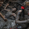 Kedonganan Köyü'nde yaşayan Balililer, toprağa şükranlarını sunmak ve manevi negatifliği götürmek için bedenlerini çamurla tamamen kapladıktan sonra okyanusta temizlendiler.