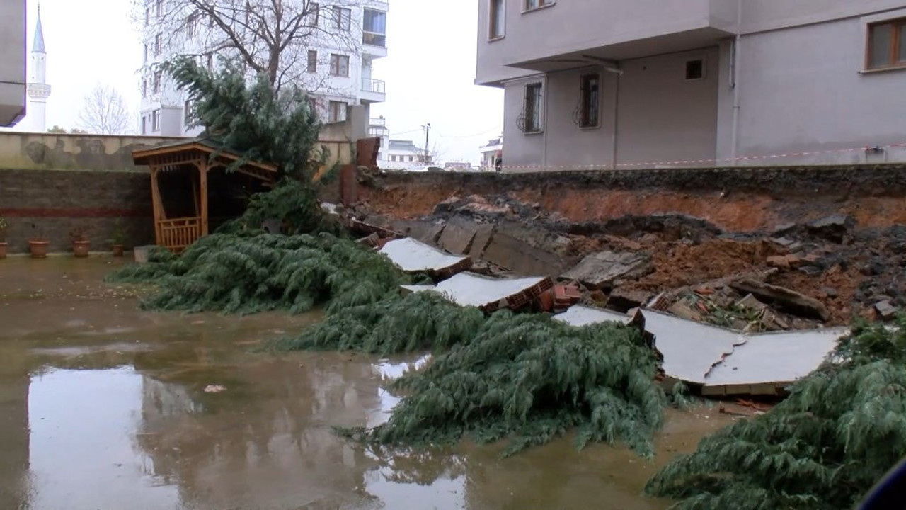 Çöken duvar, bahçedeki ağaçlara ve kamelyaya zarar verirken apartmanlara zarar vermediği belirlendi.