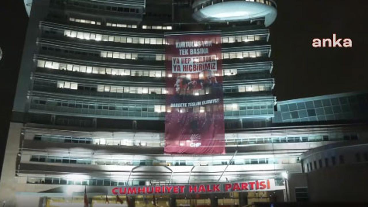 CHP Genel Merkezi'ne asılan pankartta "Kurtuluş yok tek başına ya hep beraber ya hiç birimiz. Darbeye teslim olmayız" yazıldığı görüldü.