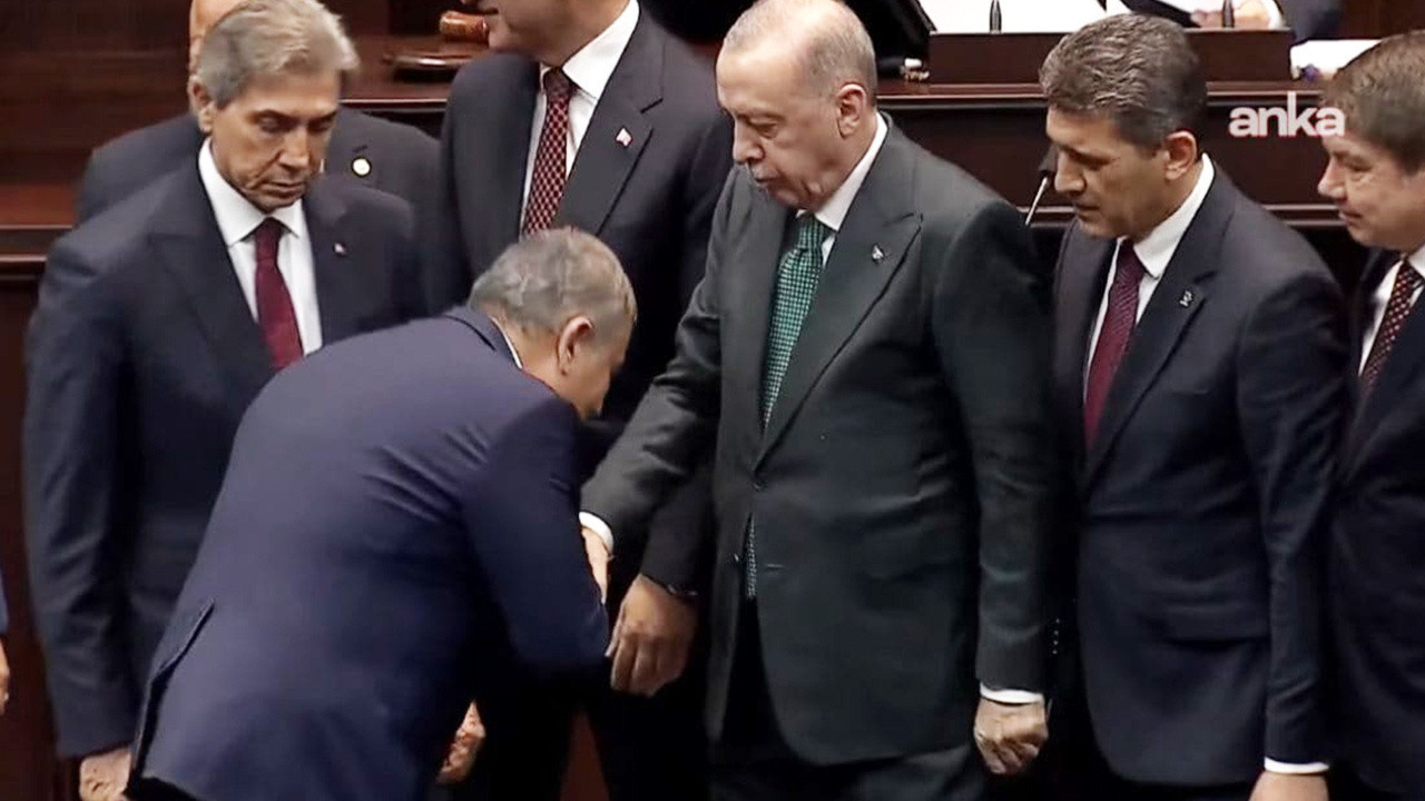 Cumhurbaşkanı Erdoğan AKP grup toplantısında konuştu. Erdoğan konuşmasının sonunda CHP'den istifa ederek AKP'ye geçen Aksu Belediye Başkanı İsa Yıldırım'a rozetini taktı. Yıldırım, rozetinin takılmasının ardından Erdoğan'ın elini öpmeye çalıştı. Erdoğan, izin vermedi.