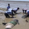Yerel halktan çok sayıda kişi, karaya vuran balinaları kurtarmak için bölgeye koştu.