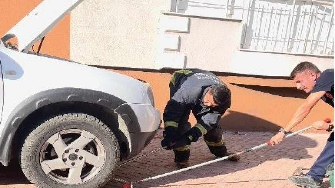 Yeni Mahalle'de aracına binmek isteyen cip sahibi, motor bölümüne girmek isteyen 1 metre civarındaki yılanı fark etti. Hemen cep telefonuyla 112'yi arayarak olayı ihbar etti.