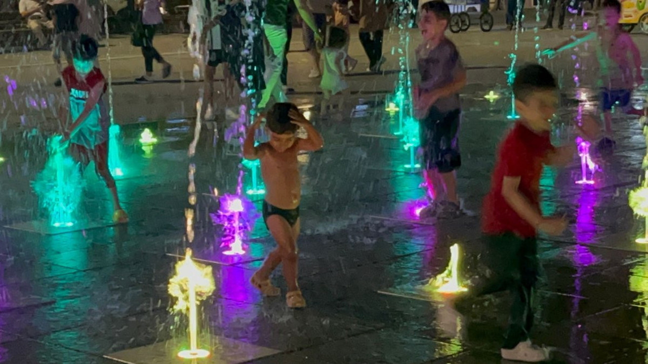 Erbaa Cumhuriyet Meydanı’nda sıcaklardan bunalan çocuklar süs havuzun içine girerek serinlediler.