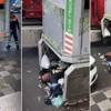 Belediye ekipleri, çöp dolu konteyneri vinçle kaldırdı. Konteynerin alt kapakları yavaşça açıldı ve kişi çöplerle birlikte yere düştü. Çöpten çıkan kişi ambulansla hastaneye sevk edildi. O anlar cep telefonu kamerasına kaydedildi.