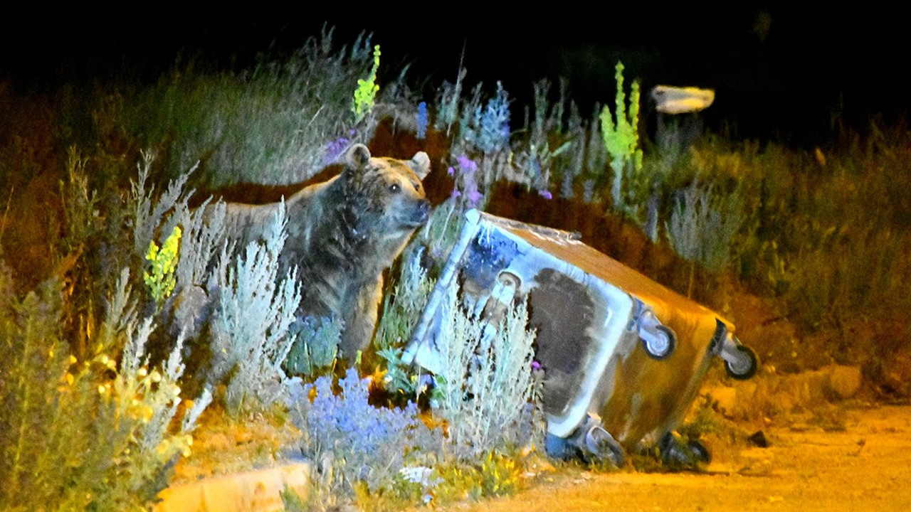 Gece saatlerinde ormanlık alana yakın Tepe Mahallesi'ndeki TOKİ konutlarının bulunduğu bölgeye gelen bozayılar, çöp konteynerlerinde yiyecek ararken görüntülendi.