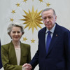 Erdoğan ve von der Leyen, merdivenlerde Türkiye ve Avrupa Birliği bayrakları önünde fotoğraf çektirdi.