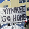 Göstericiler "Evine dön Yankee", "Grönland satılık değil" ve "Vazgeç ABD" yazılı pankartlarla tepkilerini ifade ederken, ABD'yi Ada'yı kontrolüne almaktan vazgeçmeye çağırdı.