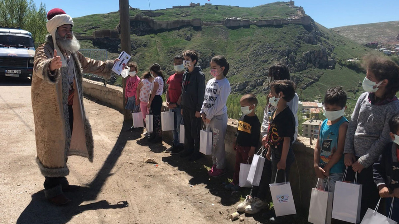 Masat köyünde de türbesi bulunan Dede Korkut karakterini canlandıran üniversite öğrencisi Samet Erdaş, sokak sokak dolaşarak çocuklara şeker ve bayram harçlığı dağıttı.