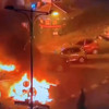 Roketin düştüğü noktada yangın çıkarken, park halindeki araçlar alev aldı.