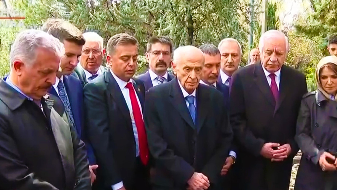 MHP Genel Başkanı Devlet Bahçeli de 66 günün ardından kameralar karşısına çıktı. Bahçeli mezarlığa geldi. Bahçeli'nin ziyaret sonrası Genel Merkeze giderek iş başı yapması bekleniyor.