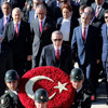 Erdoğan'ın, üzerinde ay yıldız bulunan çelengi Atatürk'ün mozolesine bırakmasının ardından, saygı duruşunda bulunuldu, İstiklal Marşı okundu.