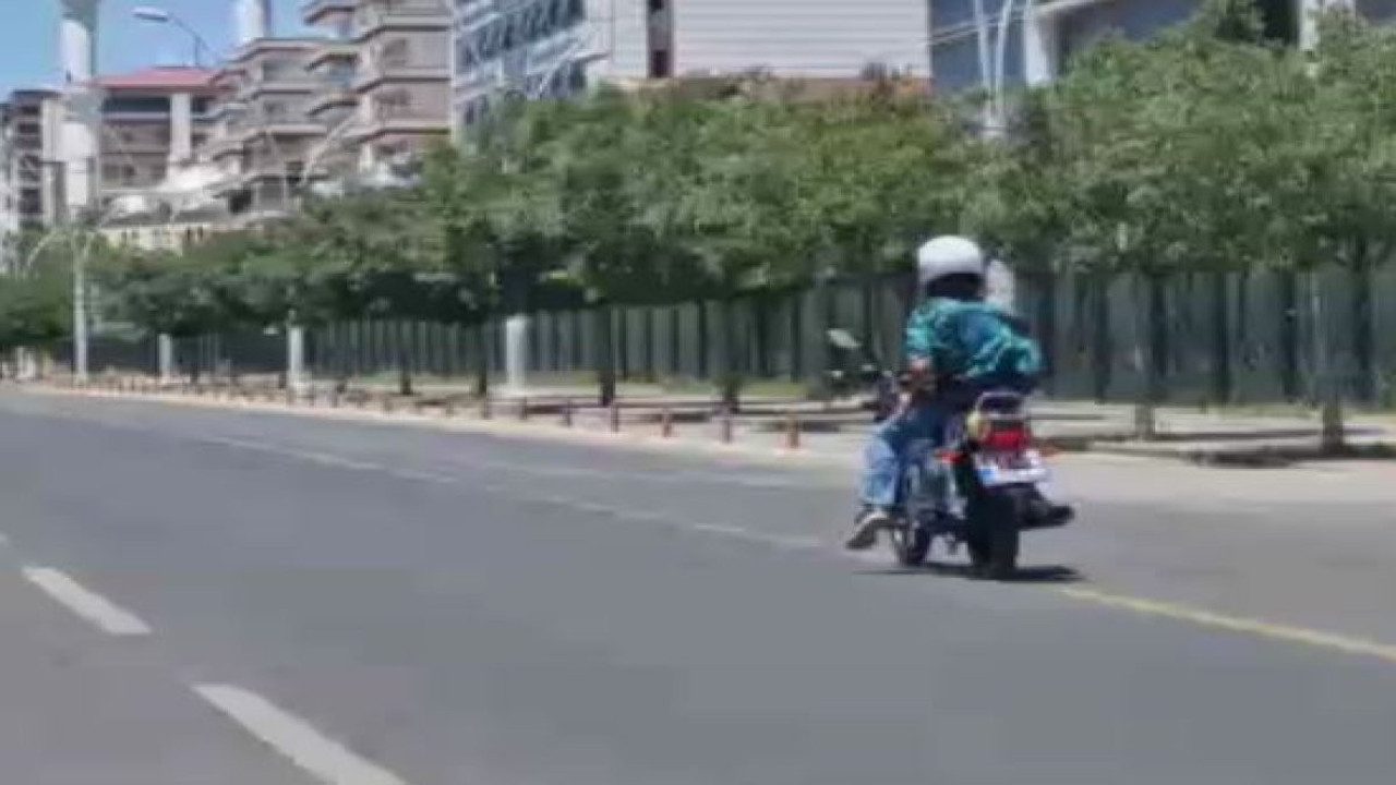 Diyarbakır'da sürücünün yüzüstü uzanarak kullandığı motosikletle trafiği tehlikeye attığı anlar cep telefonu kamerasına yansıdı.