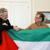 Petro'nun en küçük kızı Antonella'ya imzalı gitarını hediye eden müzisyen Waters, görüşmenin sonunda Petro ile dev "Filistin" bayrağı açtı.