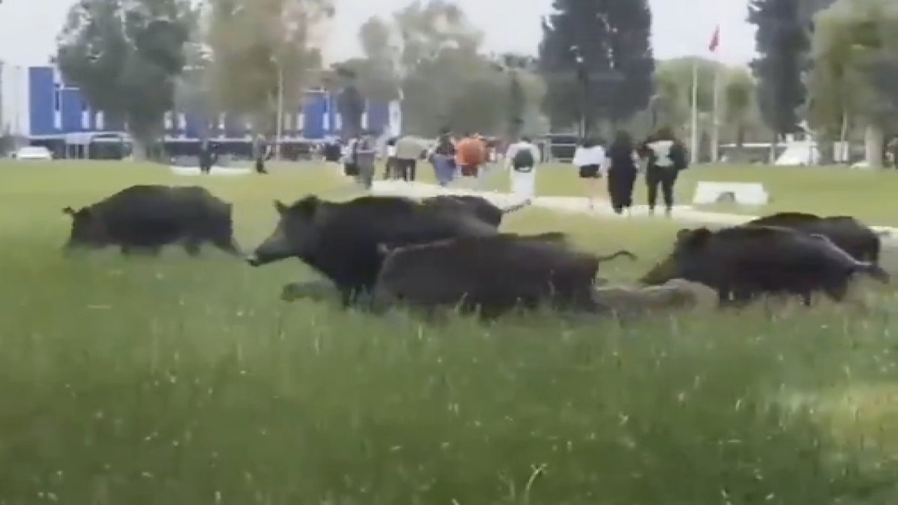 Görüntülerde, kampüs alanında dolaşan domuz sürülerinin neşeli olduğu ve dikkat çektiği görülüyor. Bu durum, özellikle kampüs içindeki yeşil alanların ve çevrenin domuzlar tarafından nasıl etkilendiği konusunda soru işaretleri oluşturuyor.