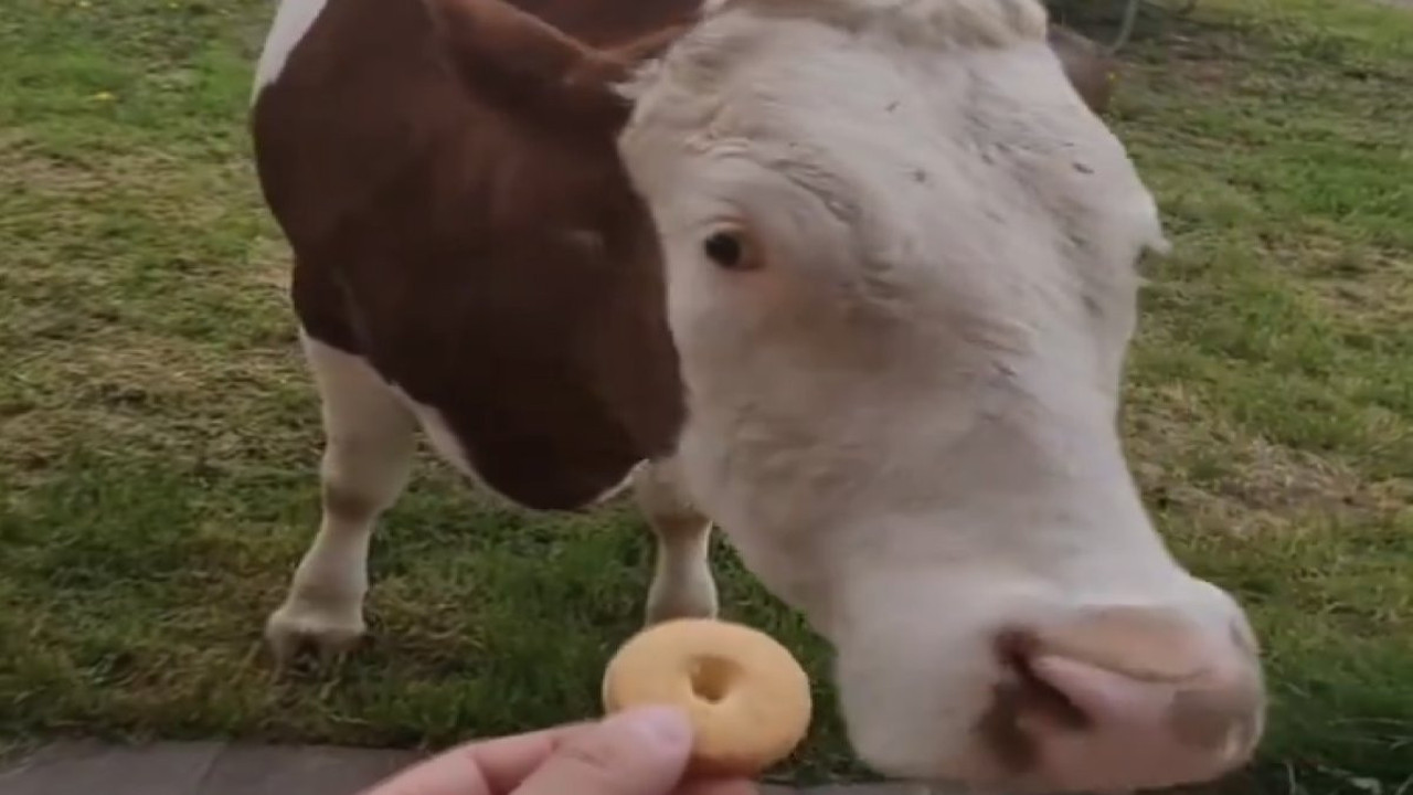 Kurabiyeyi yemek için adeta çocuklar gibi zıplayarak yaklaşan inek, sosyal medyada büyük ilgi gördü ve kısa sürede viral oldu.