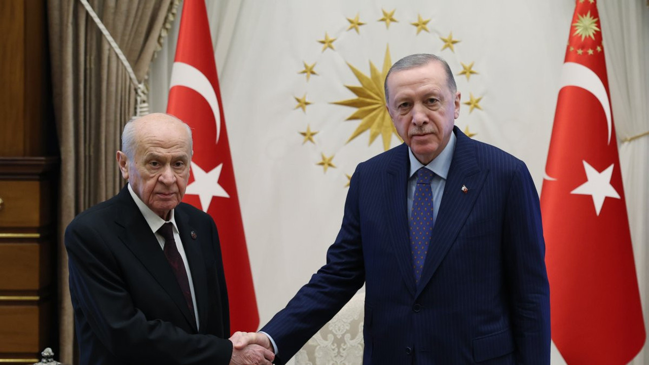Cumhurbaşkanlığı İletişim Başkanlığından yapılan açıklamada Cumhurbaşkanı Erdoğan, Cumhurbaşkanlığı Külliyesi'nde Bahçeli'yi kabul ediyor.