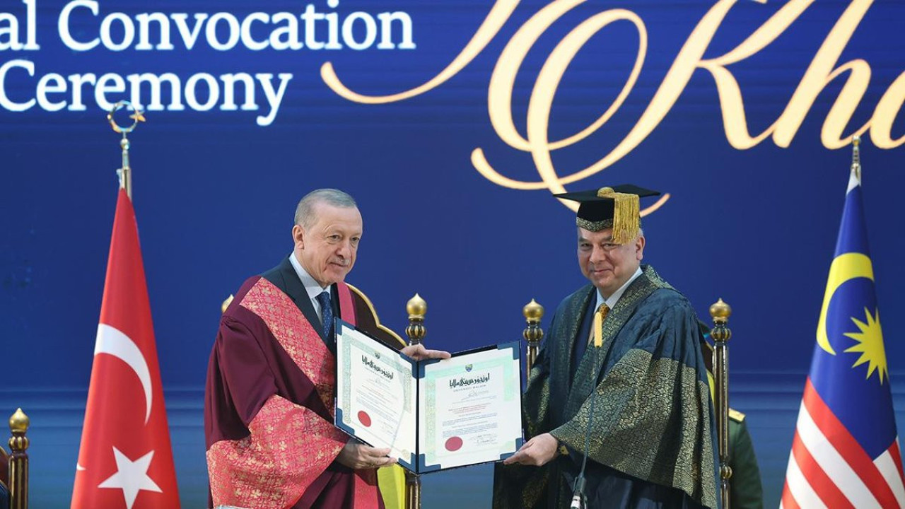Erdoğan'a, Putrajaya Uluslararası Kongre Merkezi'nde Perak Sultanı Nazrin Şah tarafından fahri doktora beratı tevdi edildi.