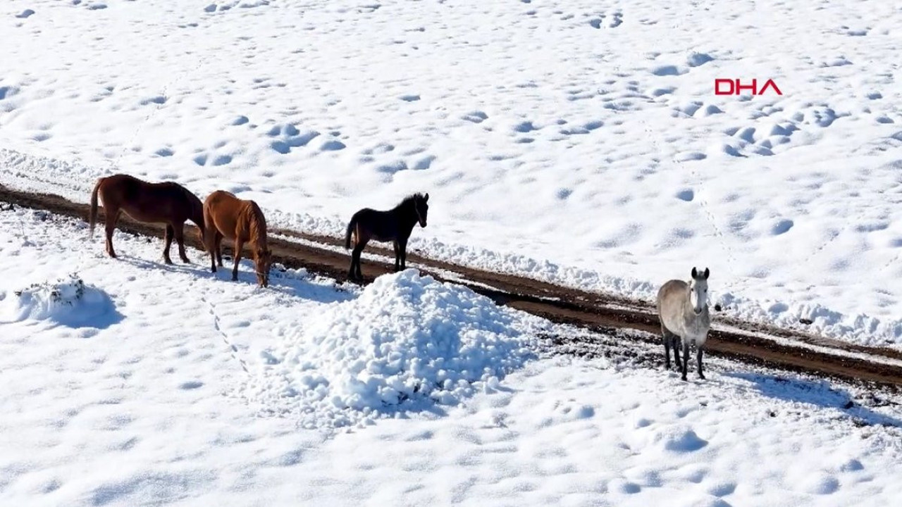Erzincan'ın Çağlayan beldesinde görülen yılkı atları, kış şartlarının ağırlaşması ile kara yoluna ve yerleşim yerlerine inmeye başladı. Yılkı atları sürü halinde dolaşıp yiyecek aradı.