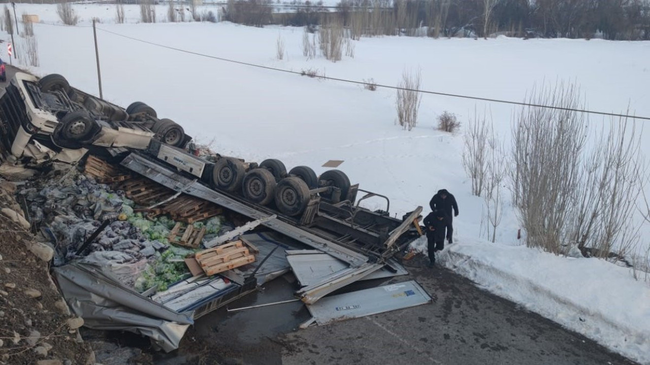 Erzurum yönüne seyreden 03 BA 506 plakalı tır, yoldan çıkarak önce bariyerleri aştı, sonra da köprü girişindeki 5 metrelik duvardan aşağı uçtu.